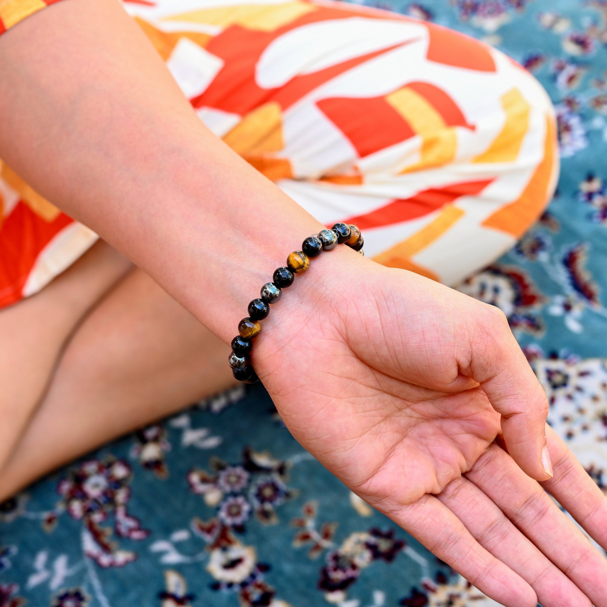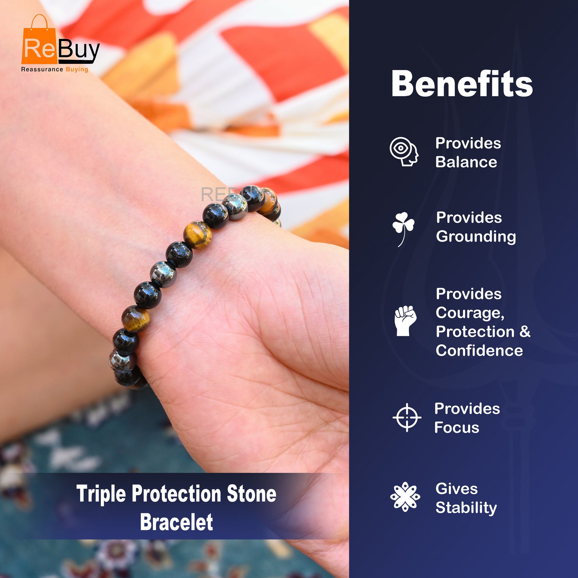 Triple Protection Bracelet With Tiger Eye, Black Tourmaline & Hematite Stone Lab Certified , Bead Size 8 mm By Rebuy