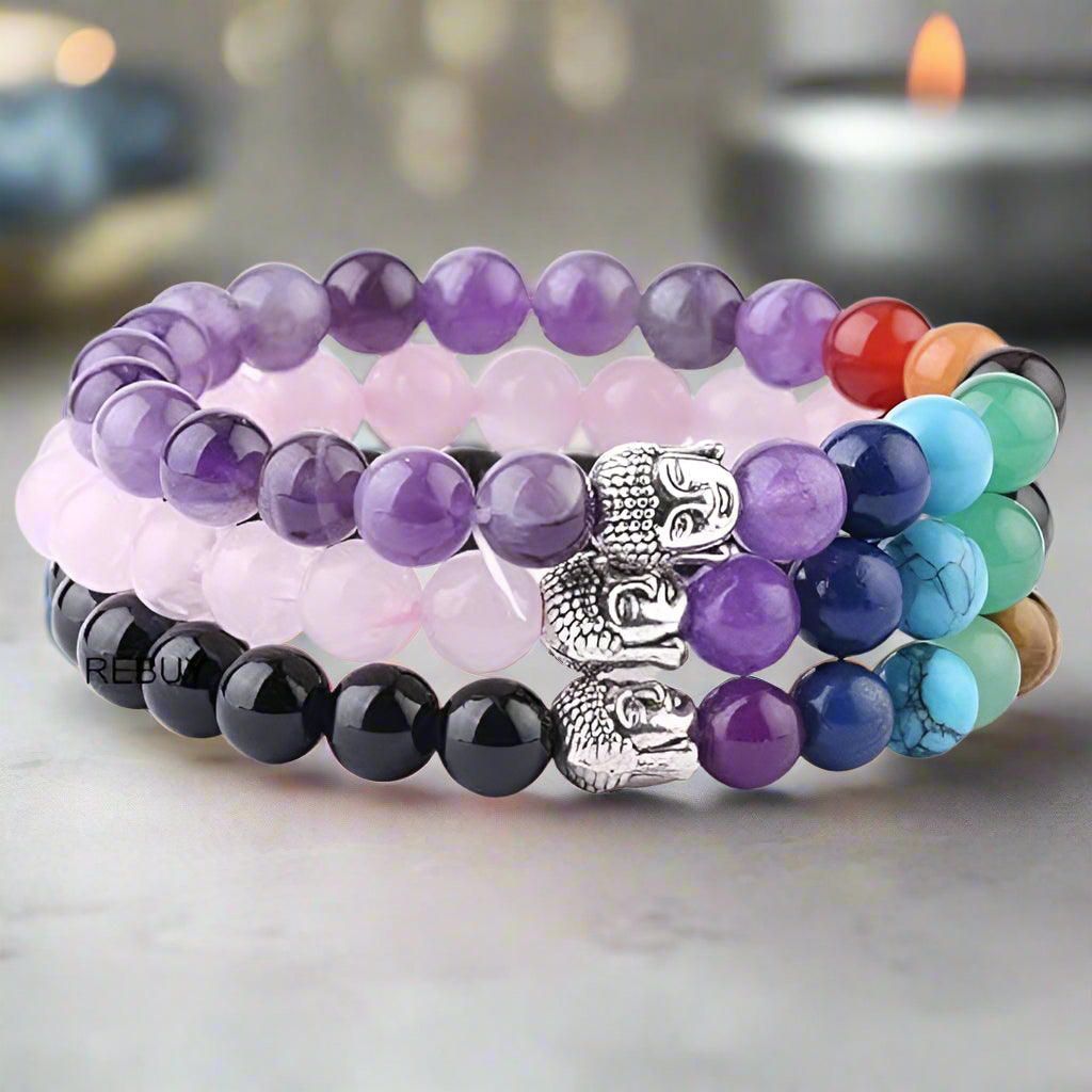 Amethyst, Rose Quartz, Black Tourmaline 7 Chakra with Buddha Head Stone Bracelet for Unisex Pack of 3 by REBUY