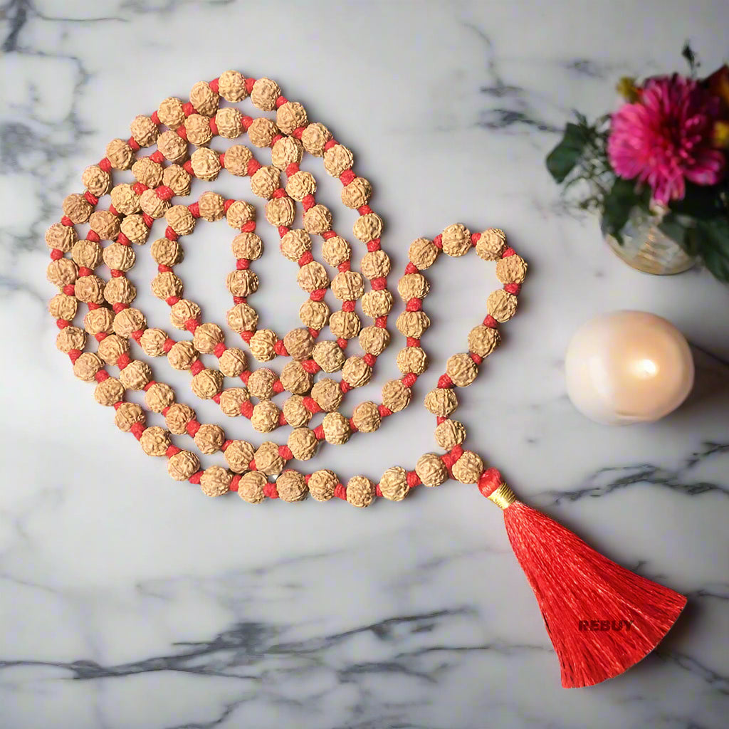 REBUY Seven Mukhi Rudraksha Japa Mala features 109 natural beads, each approximately 9MM in size, strung together in the traditional japa mala format. These Seven Mukhi Rudraksha beads are lab certified for authenticity and are spiritually significant—known to be associated with Goddess Lakshmi and believed to attract prosperity and strength.